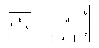 Here is a solution to the first problem using four pieces. Piece d is the 4×4 square and the 3×3 square is divided into pieces a, b, and c as shown.